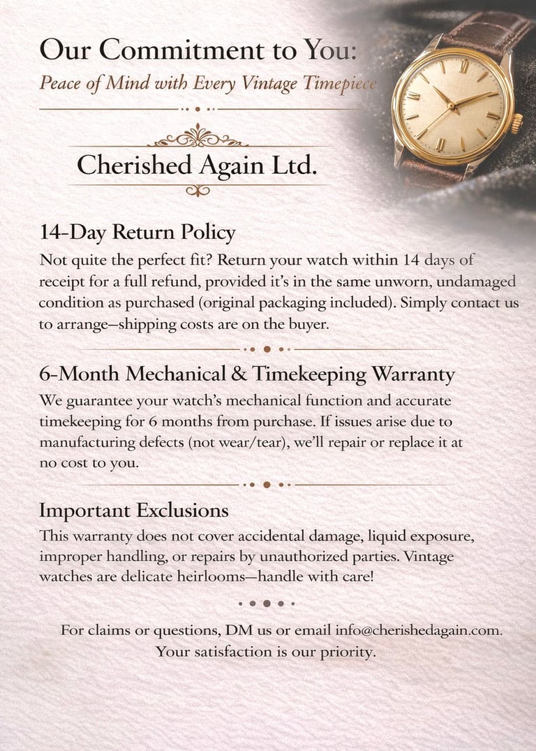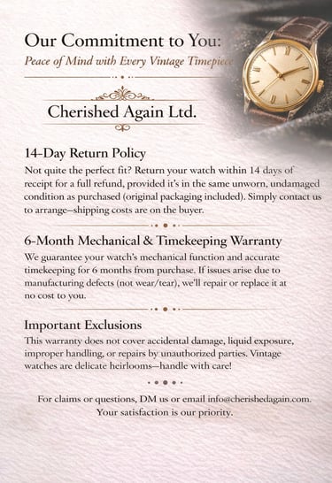 Welcome to Cherished Again: a place for people who love timeless design and the stories behind truly great pieces. We’re a small, hands-on team based in London, sourcing and curating watches with character, then restoring and presenting them to a standard we’re genuinely proud of.